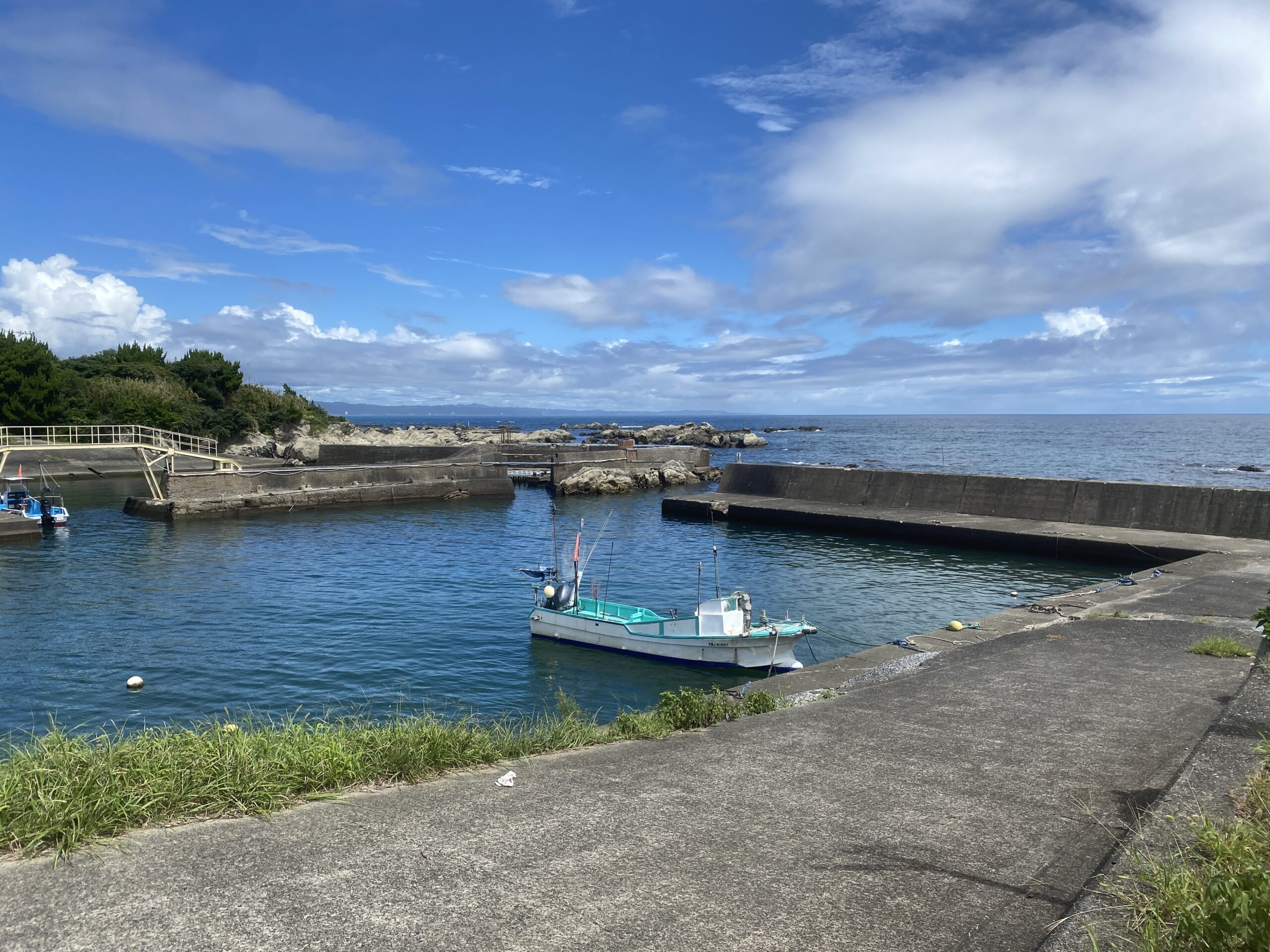 ひび割れたコンクリートの坂を下りると、港内唯一の波止堤防に出る。