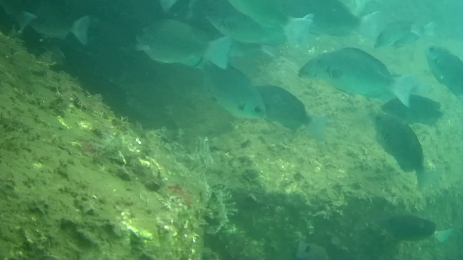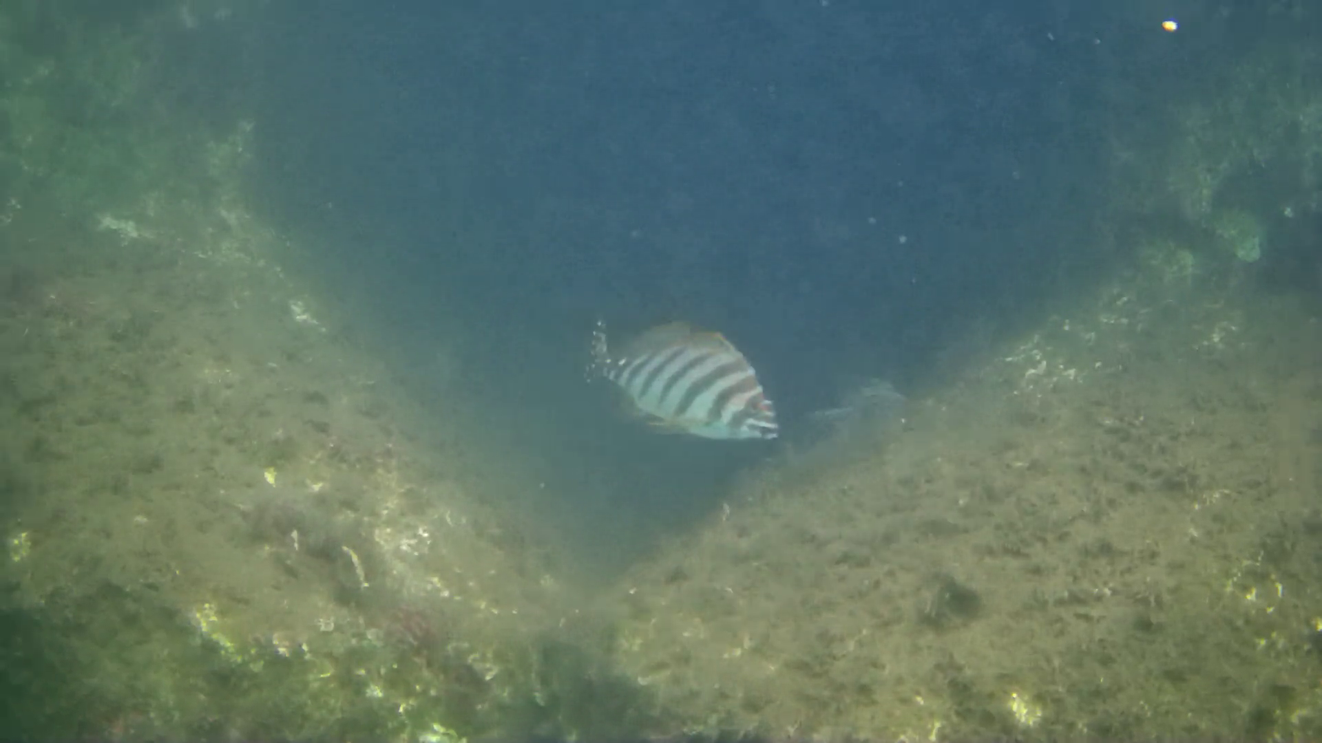 というわけでさっそく陸側護岸あたりで水中探査といってみようかしらね。あら、松崎新港は護岸のあちらこちらに穴が開いているタイプね。