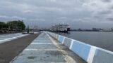 水上テラス以外の、長大な護岸はとっても浅く、干潮時にはごらんのように「ひな壇」型の一番下まで現れる。潮が満ちてくるにつれて、この「ひな壇」が一段、また一段とあがってくるのに合わせて、ハゼのような小魚も上がってくるのがなかなか楽しい。